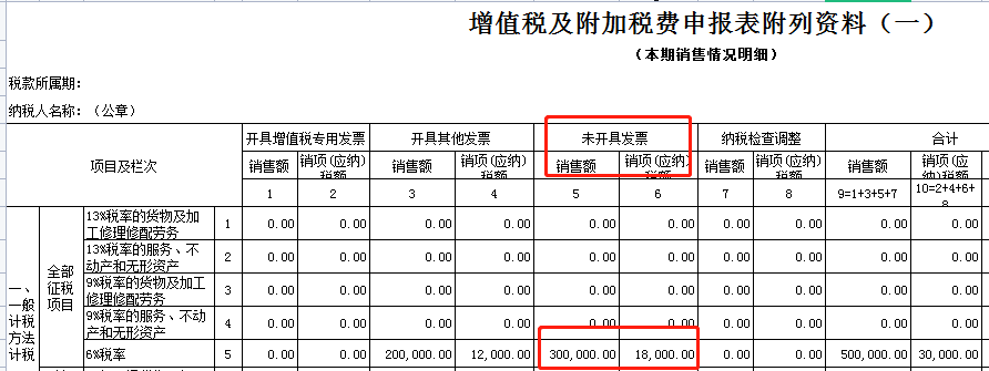 申报表填写:在《增值税及附加税费申报表(一般纳税人适用)》附列资料(一)第5至6列“未开具发票”栏次,填报相应销售额和销项税额。
