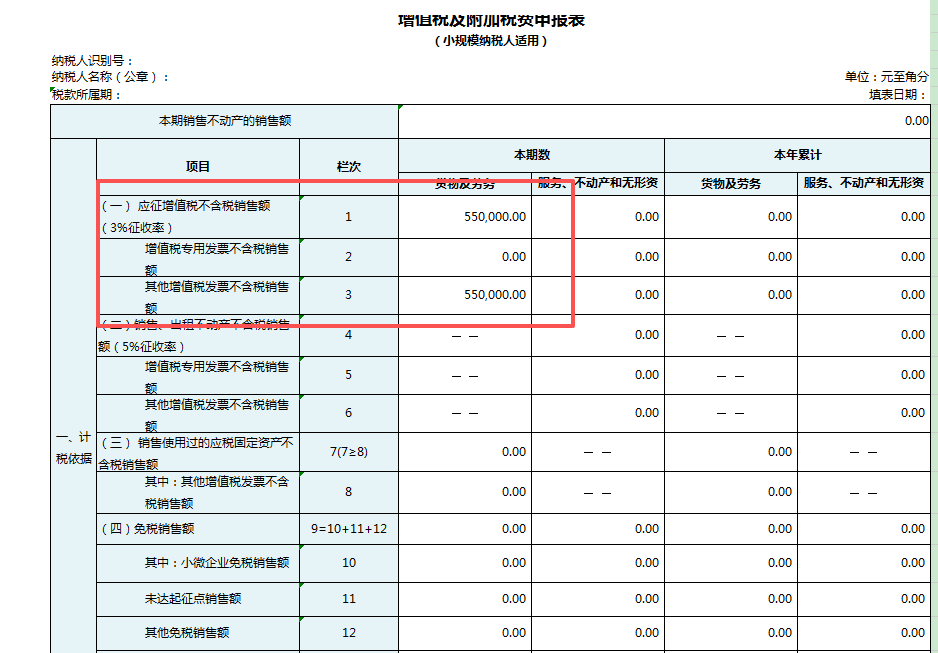 申报处理:将55万元总额(含未开票20万元)填入申报表第1栏“应征增值税不含税销售额(3%征收率)”
